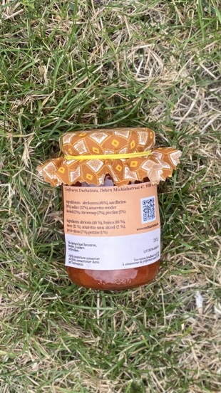 Ingrediënten: Abrikozen (48%), aardbeien (16%), suiker (32%), amaretto zonder alcohol (2%), citroensap (2%), pectine